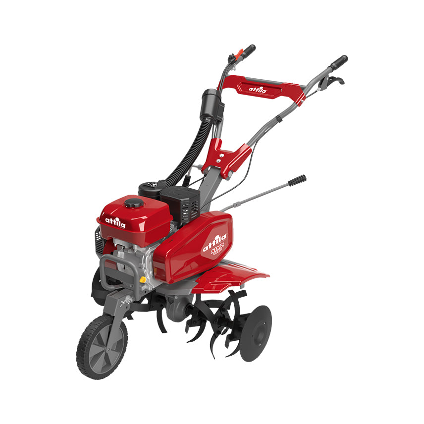 Motozappa a scoppio ATTILA ATMZ 6020. Robusta, funzionale, maneggevole. Manico regolabile e ripieghevole per un facile rimessaggio ed impugnature soft-grips. Trasmissione in alluminio a catena e cinghia. Innesto/Disinnesto frese e pulsante start/stop sul manico. 2 velocità avanti e retromarcia. 6 frese smontabili con dischi proteggipiante e regolatore di profondità. Larghezza di lavoro da 55 a 80 cm. Maniglia e ruota di trasporto anteriori. Motore posizionato direttamente sulle frese. Motore a valvole in testa potente, silenzioso e a basse emissioni, con filtro a bagno d'olio e snorkel